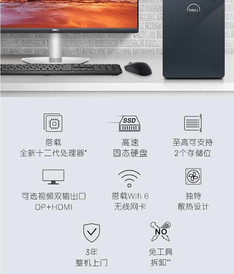 戴爾(DELL)靈越3910-18N6家用辦公學(xué)習(xí)網(wǎng)課娛樂臺(tái)式電腦主機(jī)12代i5 16G 256G+1T獨(dú)顯 加27英寸全高清顯示器(S2721NX)